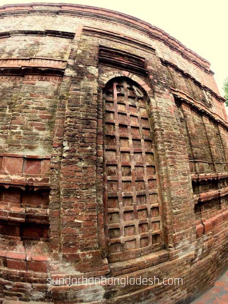 The roof of the temple is built with a dome in the Charchala style. Thin bricks have been used in the construction. The exterior of the temple has been decorated with terracotta bricks with geometric designs, flowers, vines and leaves.