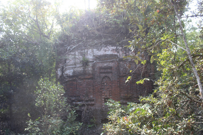 Deep forest, surrounded by dense trees. In the meantime, an ancient brick-and-stone temple stands tall. Officials from the Department of Archaeology believe it is 400 years old. Handmade bricks, lime, and local river sand were used to build the temple.
